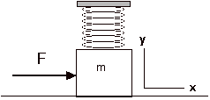 A block of mass m=5 kg is attached to a spring with spring constant, k = 200 N/m, and hangs down so that it rests on a table as shown below. This causes the spring to stretch by 10 cm from its equilibrium length. Assume the static coefficient of friction between the table and block is 0.6. An external force, F, is applied in the positive x-direction, as shown.